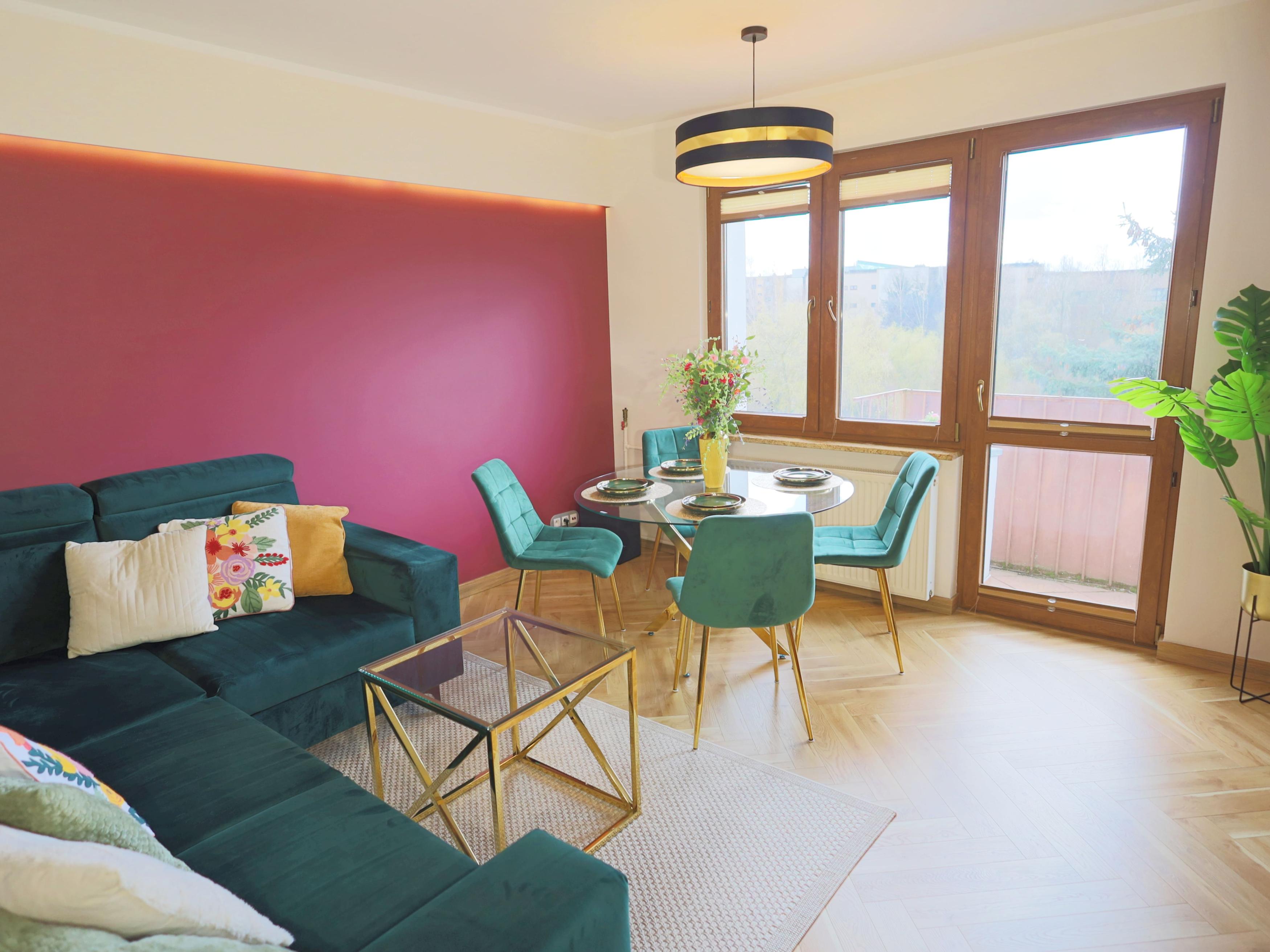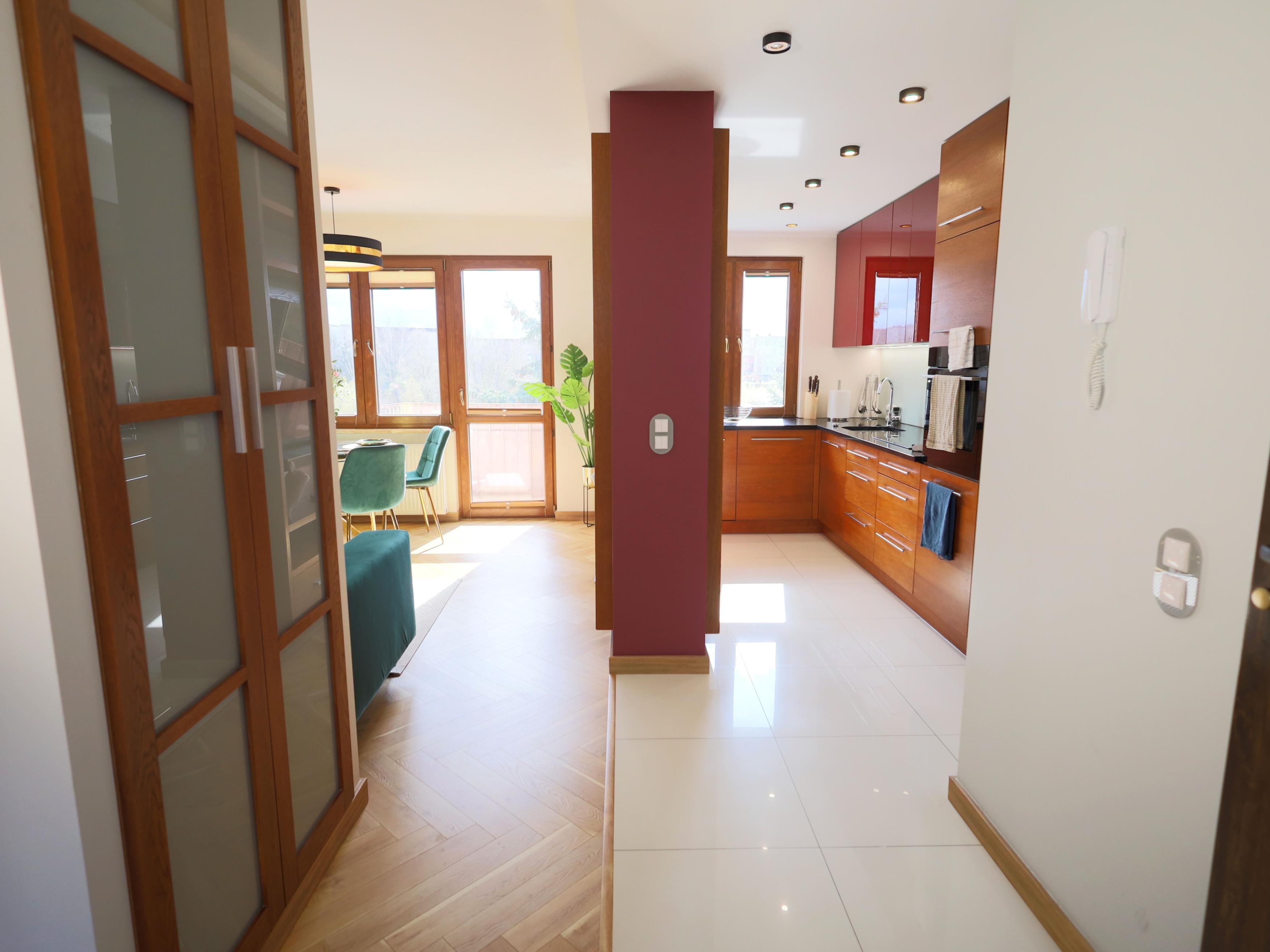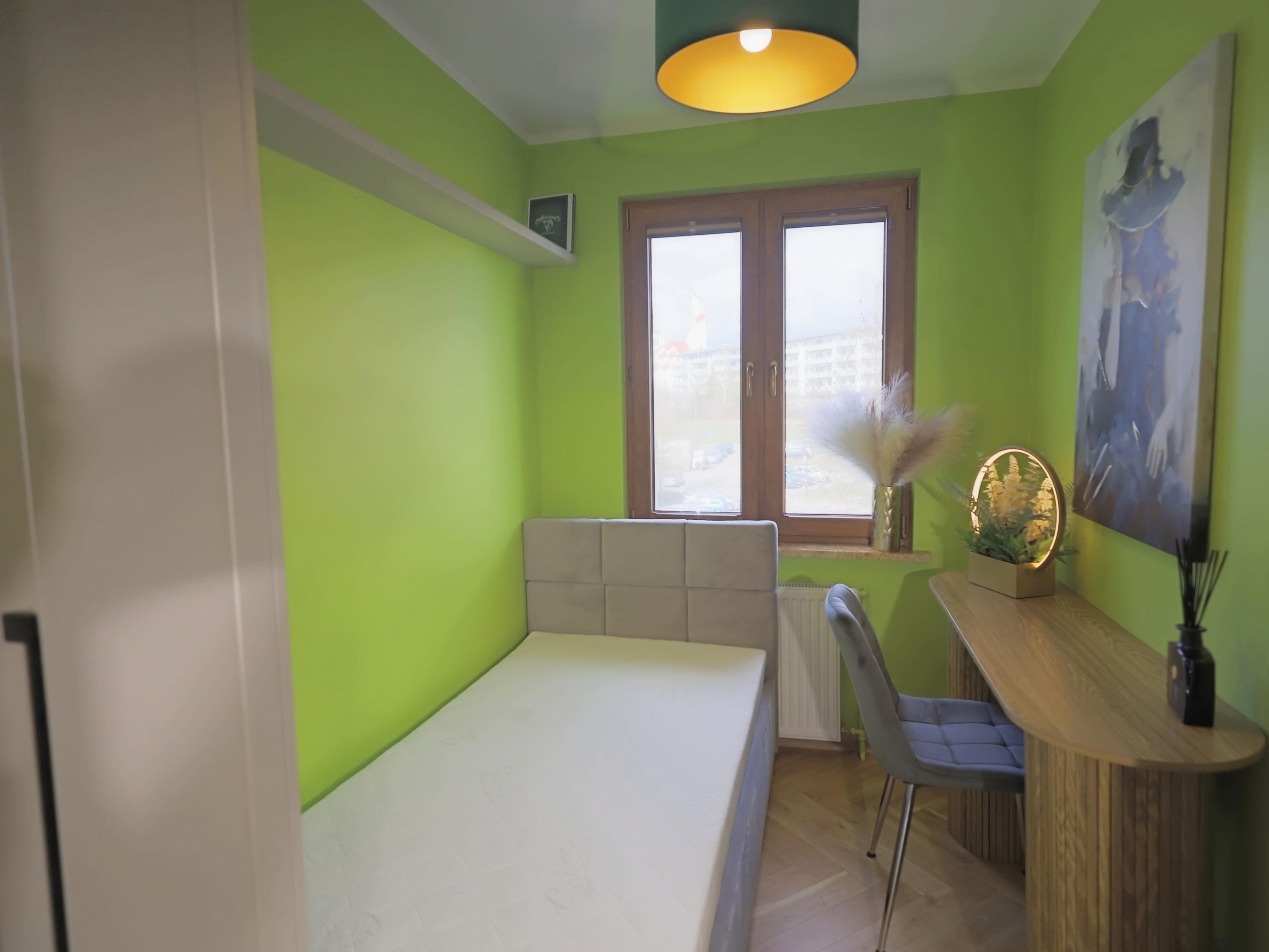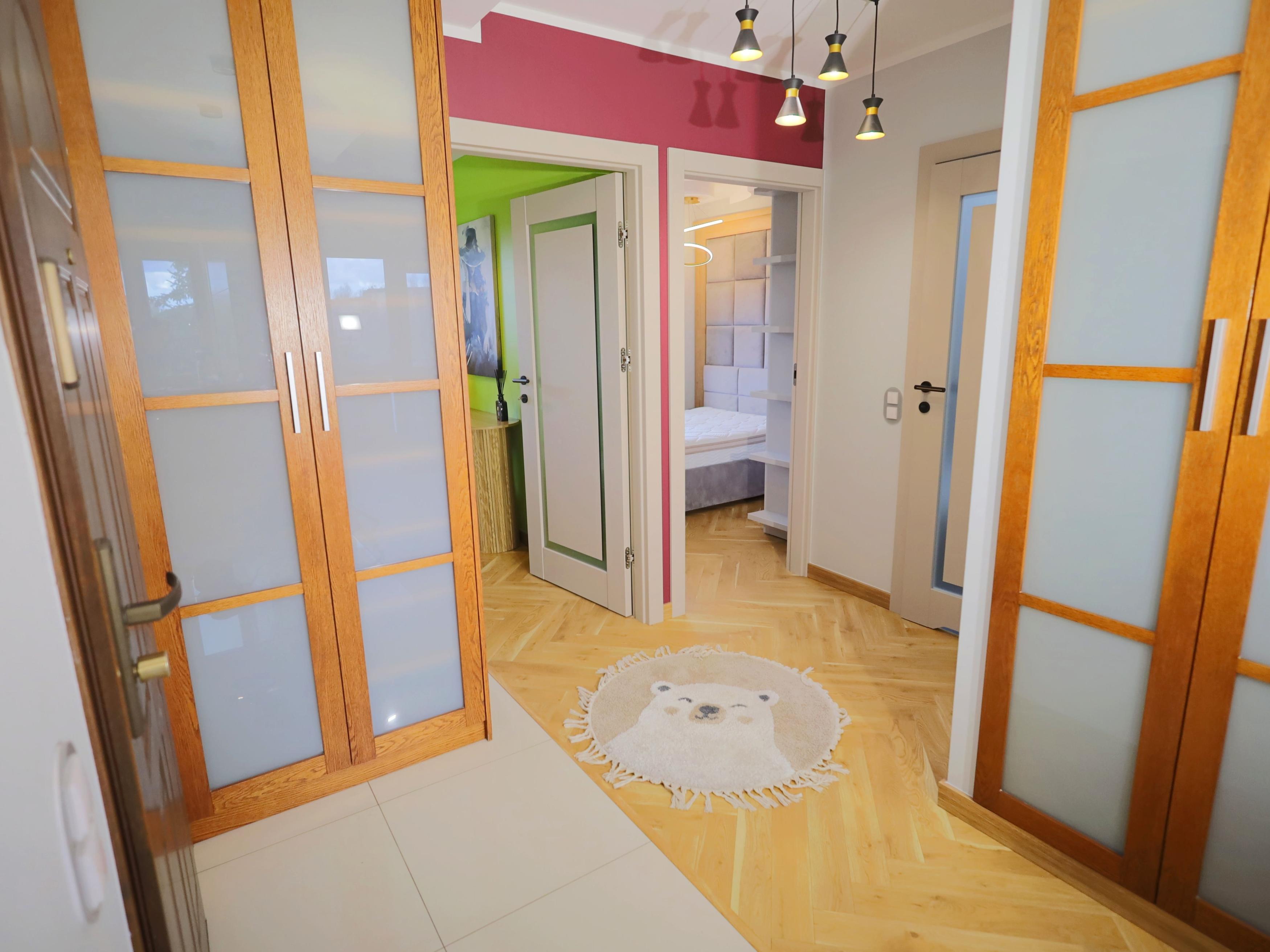 Mieszkanie jest w pełni umeblowane i wyposażone w wysokiej jakości sprzęt RTV i AGD, gotowe do wprowadzenia bez dodatkowych nakładów finansowych. Wnętrza zostały zaprojektowane z myślą o funkcjonalności i wygodzie – szafy w zabudowie zapewniają dużo miejsca do przechowywania.